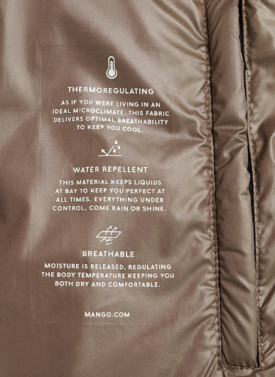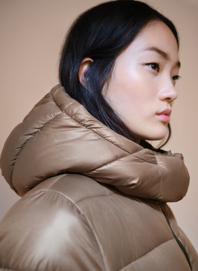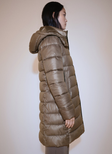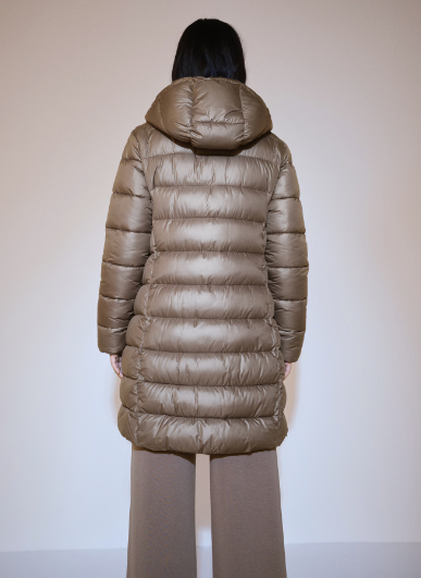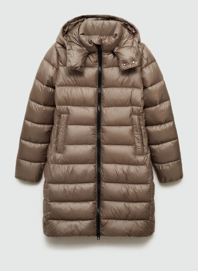 Nylon fabric. Straight design. Quilted design. Long design. Turtleneck. With hood. Long sleeves. Two side pockets. Zip and button fastening. Inner lining. The model is 1.75 tall and is wearing a size 36. Water-repellent: The durable finish of this garment protects against light rain, repelling contact with water and raindrops.