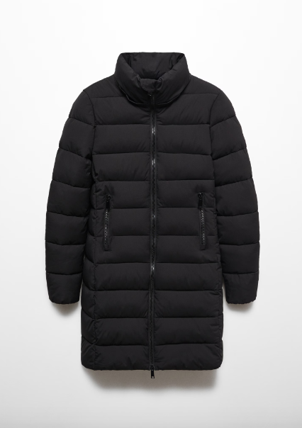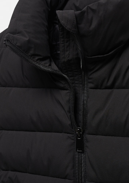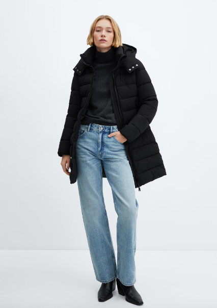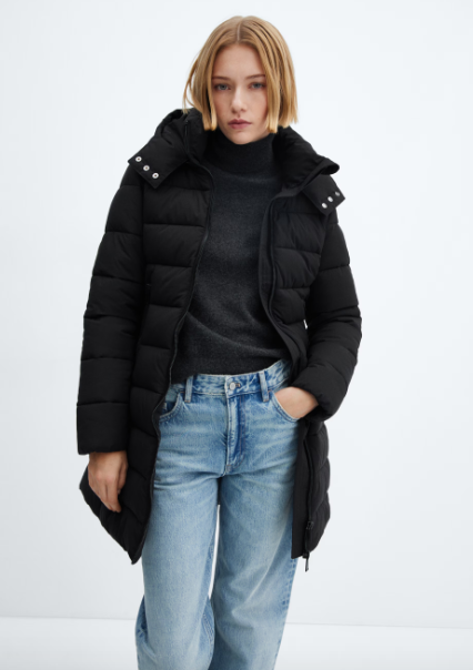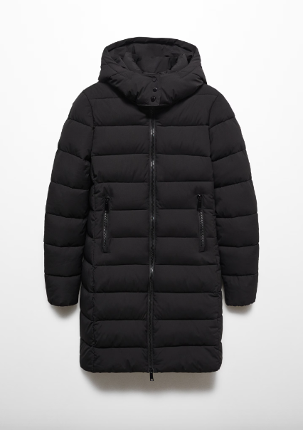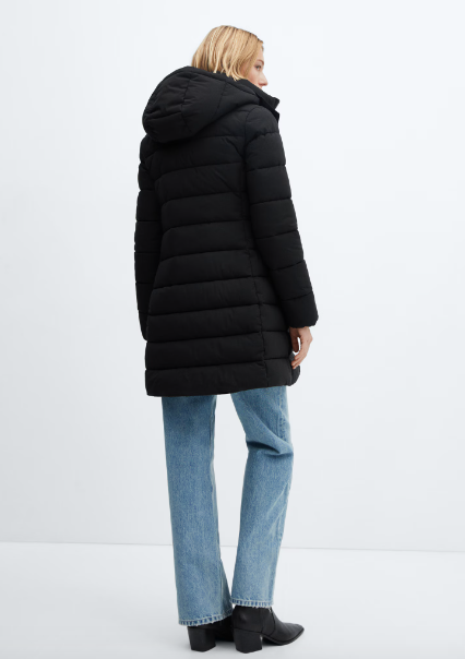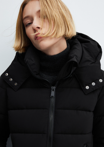 Medium quilted coat. Detachable Hood. Quilted design. Medium design. Straight design. Turtleneck. Long sleeves with elastic cuffs. Zip pockets on both sides. With filling. Zip fastening. Inner lining. Water-repellent: The durable finish of this garment protects against light rain, repelling contact with water and raindrops.